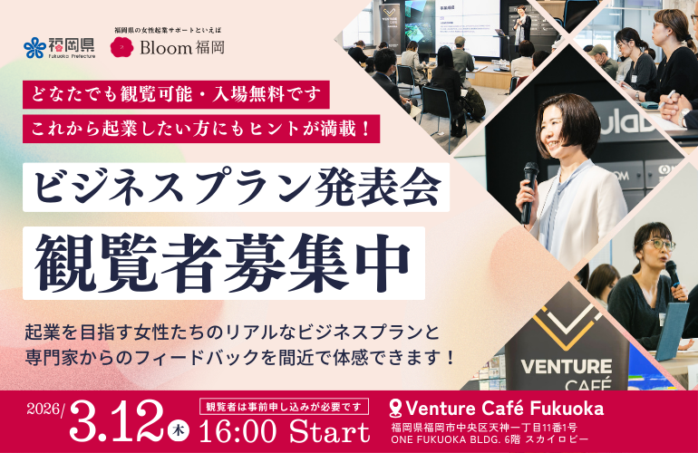 2024年9月から、福岡県が取り組んでいる女性起業サポート「Bloom福岡」。本気の起業に取り組んでいる女性起業家たちが、世界的スタートアップ支援機関CICの姉妹機関「Venture Café Fukuoka」が開催する「Thursday Gathering」で、これまで磨き上げてきたビジネスプランをPRします。