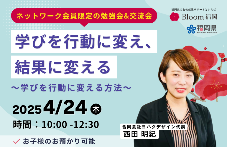 起業を目指す女性を応援するBloom福岡では、「福岡ウィメンズBizネットワーク」会員を対象とした、定期的な「勉強会」を開催しています。今回は「学びを行動に変え、結果に変える」をテーマに、合同会社 ヨハクデザイン代表 西田 明紀さんを講師としてお...